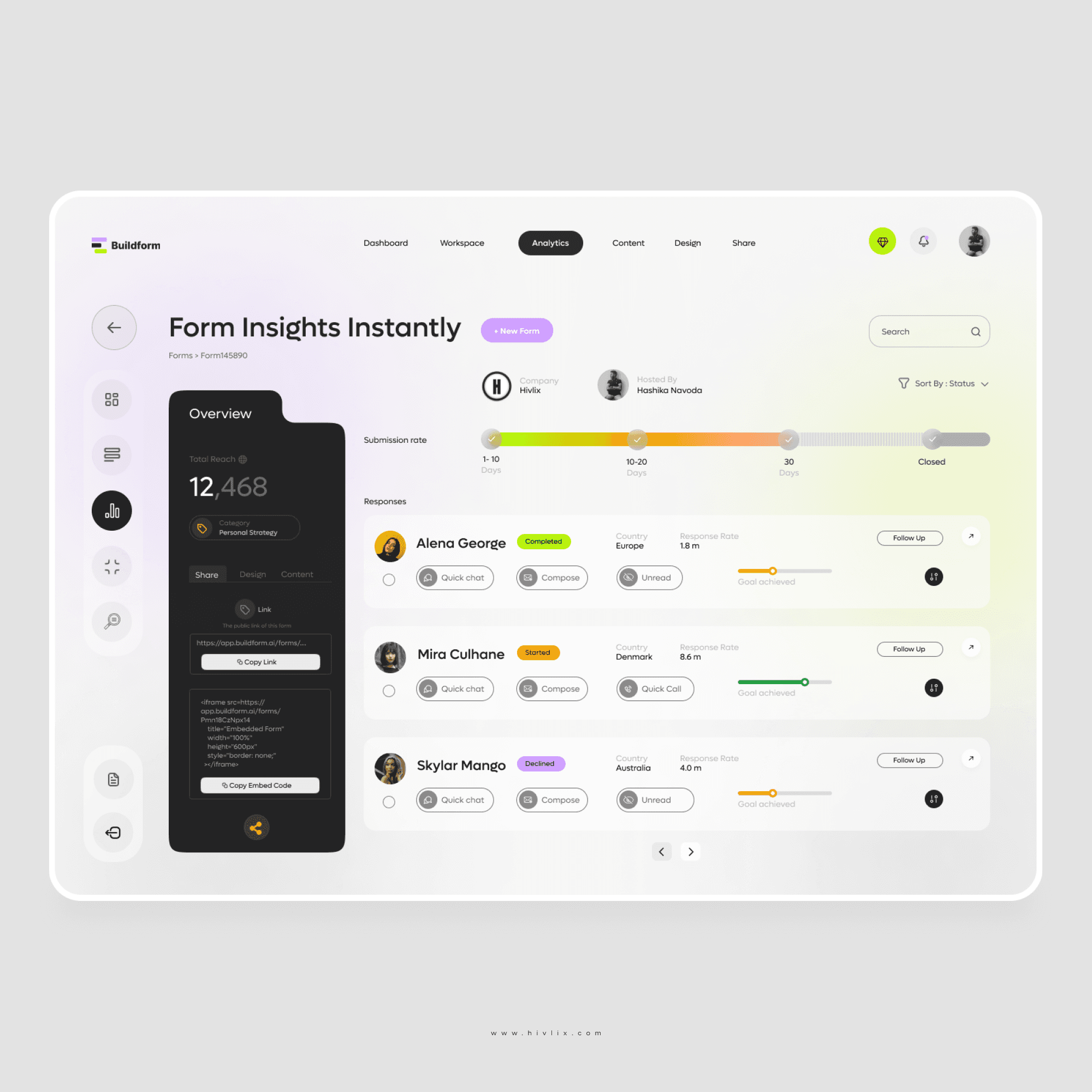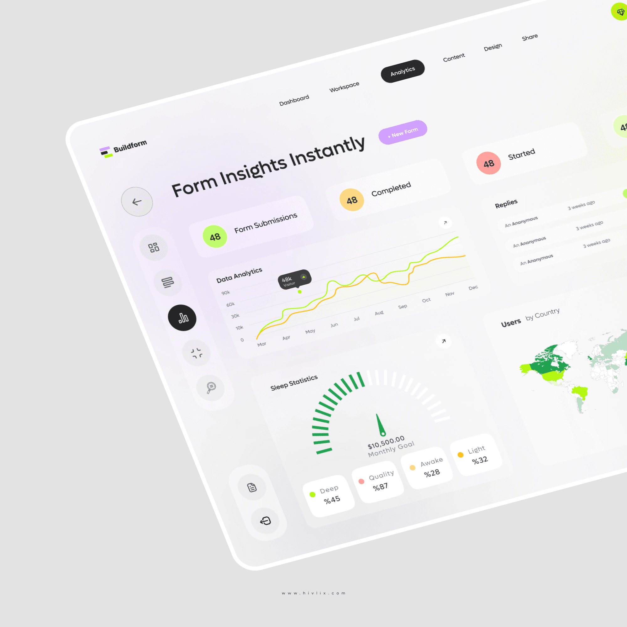 To design a user-centric analytics dashboard that provides an intuitive overview of form submissions. The goal was to enable users to monitor, analyze, and gain actionable insights into their form data with ease, leveraging graphical UI components for a visually engaging experience.